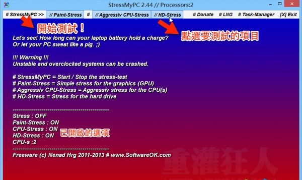 第2步:先点视窗上方的选项,选择要测试的项目。画面下方有显示「ON」的话,表示该测试会被执行。要开始测试的话,请按一下左上角的「StressMyPC」即可开始。