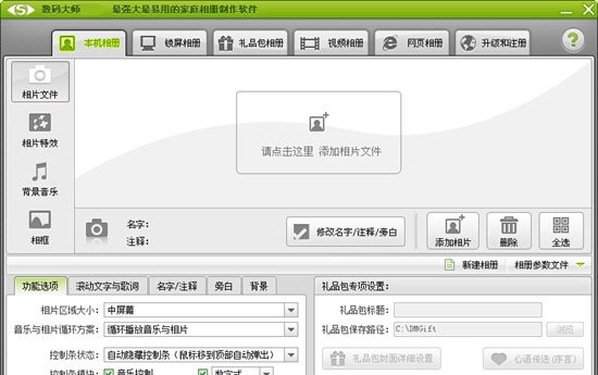 以上介绍的是软件的视频相册功能,该功能导出的相册不但可以直接发给他人,上传网络,还可以刻录成光盘珍藏呢。其实软件各种相册的参数都可以同步加载,所以如果想看一下其他的相册,直接切换到相应的相册功能选项卡即可。比如还可以导出礼品包相册,在此我们可以为礼品包相册设置一个别致的封面,如设置封面主题、心语传送等等,让制作的相册更具温馨气息。