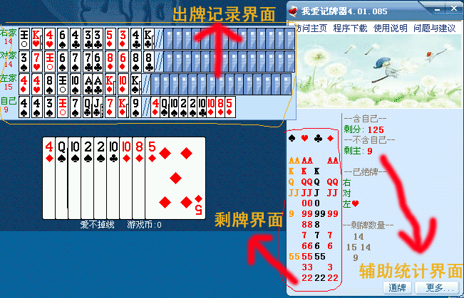 剩牌界面(主界面):统计其他玩家手中的牌型(除去自己手中的牌和大家出过的牌,以及你能看到的牌),这样你就知道外面还有些什么牌了。大王用Z表示,小王用F表示。