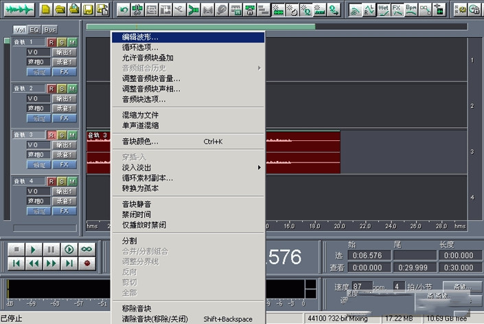 10、怎么样?听到了吗?满意吗?还可以是吗?如果觉得你录制的声音音量偏小,那么就右键点击“调整音频块音量”,直到两轨的声音达到你满意的程度为止。下面就把这两个音轨混缩成一个音轨吧。在第三轨上右键单击,弹出菜单中选择“混缩所有波形文件”。