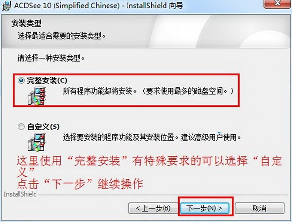 这里一般使用“完整安装”有特殊要求的可以选择“自定义”然后点击“下一步” 如图五。