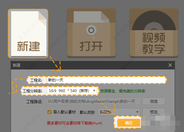 1、打开软件,点击【新建】,将工程名设置为【新的一天】,选择工程分辨率,点击【确定】。