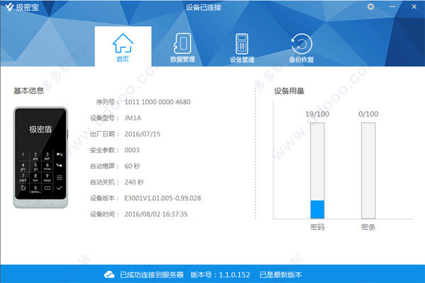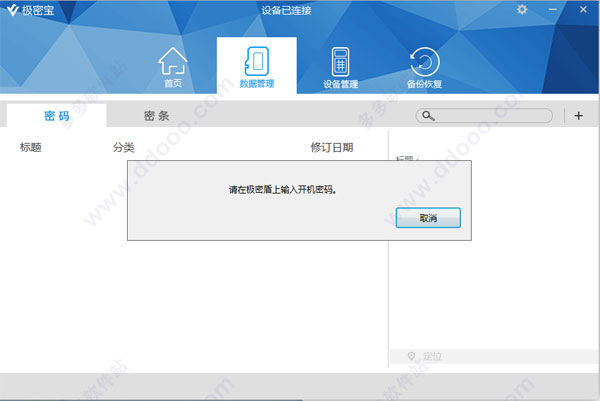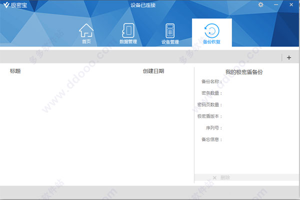 2、连接极密盾设备后,其具有创建密条及密码的功能,同时可对存储在内的数据进行备份和恢复,如下图所示: