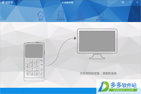1、打开极密盾电脑版客户端,程序默认显示为未连接极密盾设备的界面,如下图所示: