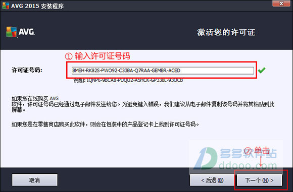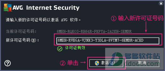 3、输入AVG“新许可证号码”,然后单击“激活”。
