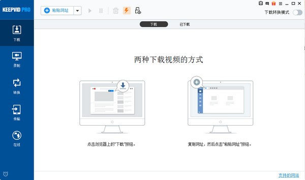 KeepVid下载器是一款专业免费的多线程视频下载软件,该软件主要为用户带来了四个界面功能,能够帮助用户高效地从各种网站下载视频或音频内容,并且KeepVid不仅能够下载视频或音频资源,同时还支持在线观看功能,是极为强大的视频下载器。