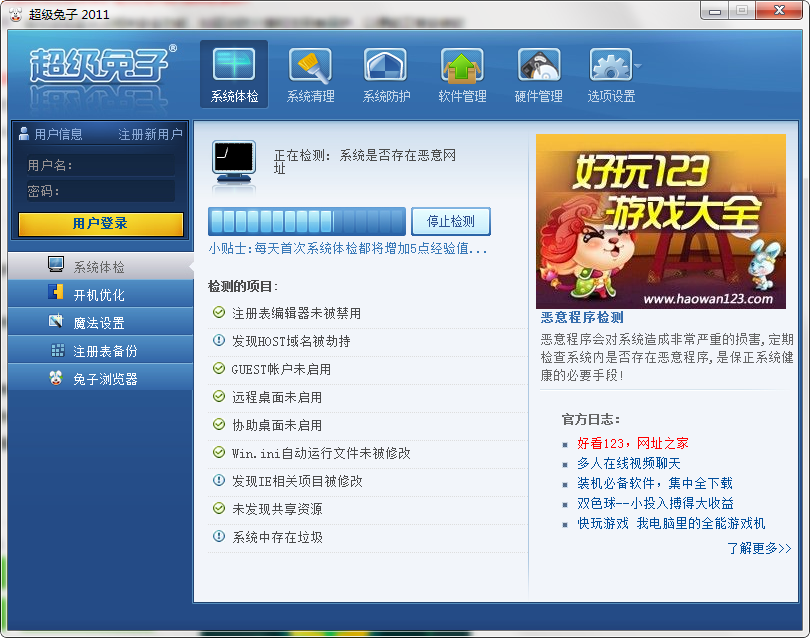 超级兔子电脑版是一款对电脑系统进行优化的软件,出来一些简单的垃圾清理外,还提供对电脑的各种配置进行测试功能,查看其的稳定性,从而更好的对电脑进行运行,操作简单的同时功能也是很完善的呢,你只需要打开界面就知道如何操作,感兴趣用户快来下载哦!