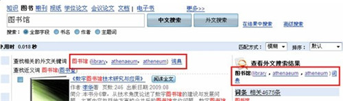 在搜索框直接输入关键词,关键词可定位到全部字段,书名,作者或主题词中,然后点击"中文搜索",将为您在海量的图书数据资源中进行查找。如果您希望获得外文资源,可点击"外文搜索"。