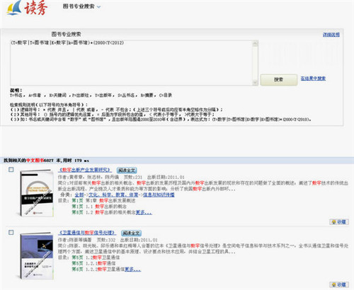 读秀学术搜索是图书搜索及文献传递服务的系统平台,提供了330多万册的图书书目数据检索、3亿多条图书目次检索、240多万电子图书全文检索,实现了10亿多页全文文献的自动传递服务,提供多面检索技术,实现了图书馆的纸质图书、电子图书等资源的统一检索及馆际互借参考咨询服务功能。用户可以通过读秀对图书、期刊、报纸、会议论文、学位论文等文献资源的题录信息、目录、全文内容进行搜索,提供图书封面页、目录页、正文部分页的试读,还可以对所需内容进行文献传递,收录230多万种图书、近9亿多页的图书文献资料,2亿多条书、刊、报、会议文献目次,年更新数据10万种以上。