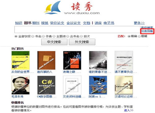 选择知识频道,在搜索框中输入关键词,然后点击"中文搜索",将为您在海量的图书数据资源中,围绕该关键词深入到图书的每一页资料中进行信息深度查找。