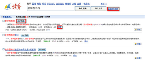 4、提供多种全文获取服务:如图书,包括借阅馆内纸本图书(本馆馆藏纸书)、阅读电子图书全文(本馆电子全文)、参考咨询(图书馆文献传递),以及网上图书链接等。其中文献传递服务是读秀服务的一大特点,为读者提供所需要内容页码范围的局部原文,即读者选定所需的页数,提交需求信息,原文以电子邮件的方式,发送到读者的信箱中,每次发送的原文可以有20天的有效期,这一期间内,读者可以随时浏览,不受空间和时间的限制。