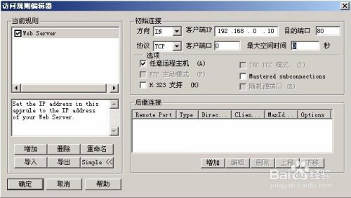 在出现下图的窗口时,单击“增加”按钮,添加一条新的访问规则,按“删除”按钮,可以删除该规则,选择一条规则,按“重命名”按钮,为其改名,如果用户要添加新的规则,在对应的右边窗口中,设置初始连接的方向、协议、端口等信息,在选项区域中设置服务模式,在后继连接区域中设置后继连接的相关信息。