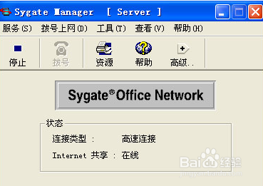 安装好的Sygate服务器端程序,在系统的通知去区域双击e图标,出现Sygate服务器程序的主窗口,显示如图所示,程序服务器已经正常运行,如果要将服务中断,选择‘服务’‘停止’项即可。
