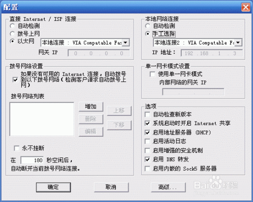 Sygate作为一个网关型代理服务器,具有站点的访问控制,指定允许和过滤IP、DHCP、动态IP分配,记录日记、防火墙安全保护等功能,并且支持二次代理。单击工具栏上的‘配制’按钮,在弹出的如图所示的窗口中设置、记录日志,自动拨号,安全性等。