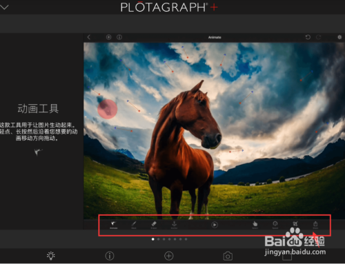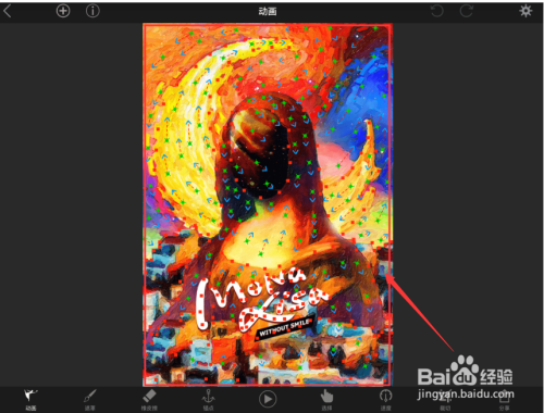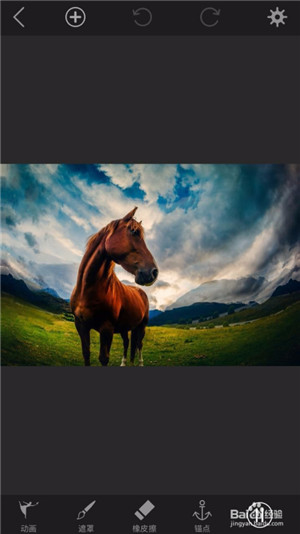 第一步,这款工具用于让图片生动起来,轻点,长按,然后沿着想要的动画移动方向拖到。遮盖图片上你不想移动的区域。