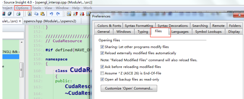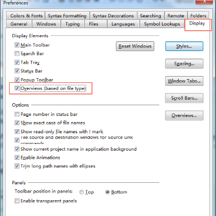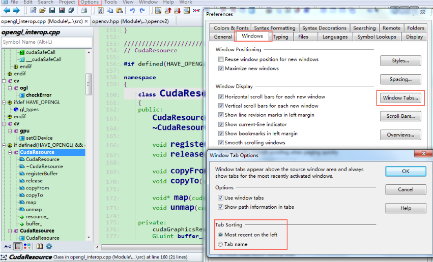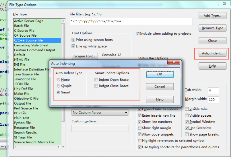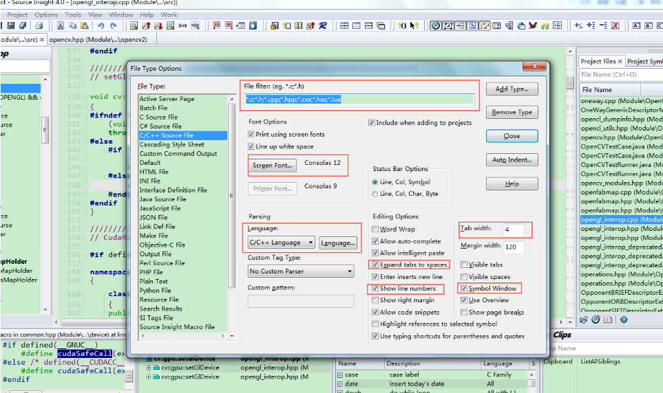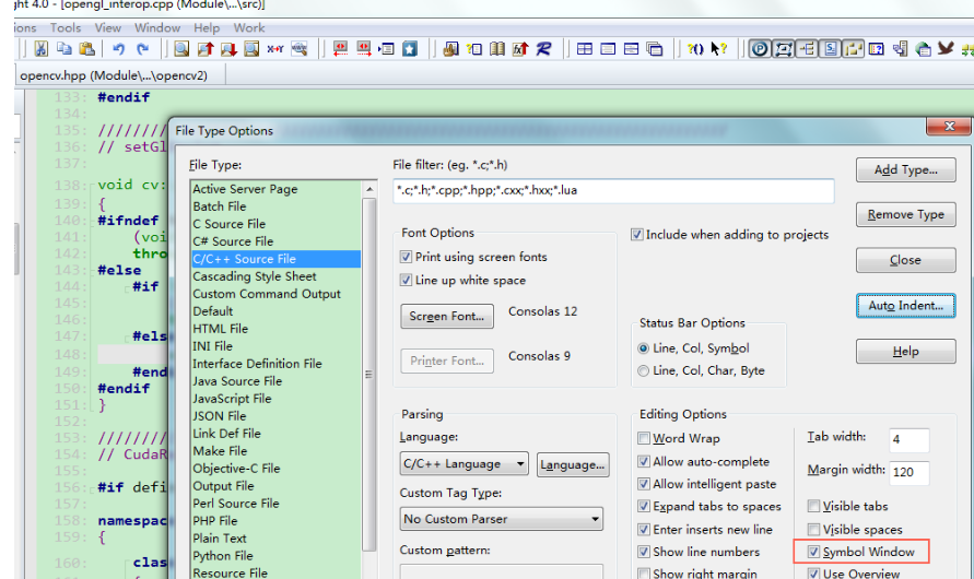 (2)、Alt+Y打开文档类型选项窗口,修改字体显示大小、是否显示行号、解析语言选择、工程文件过滤、扩展tab键、是否显示符号窗口等。