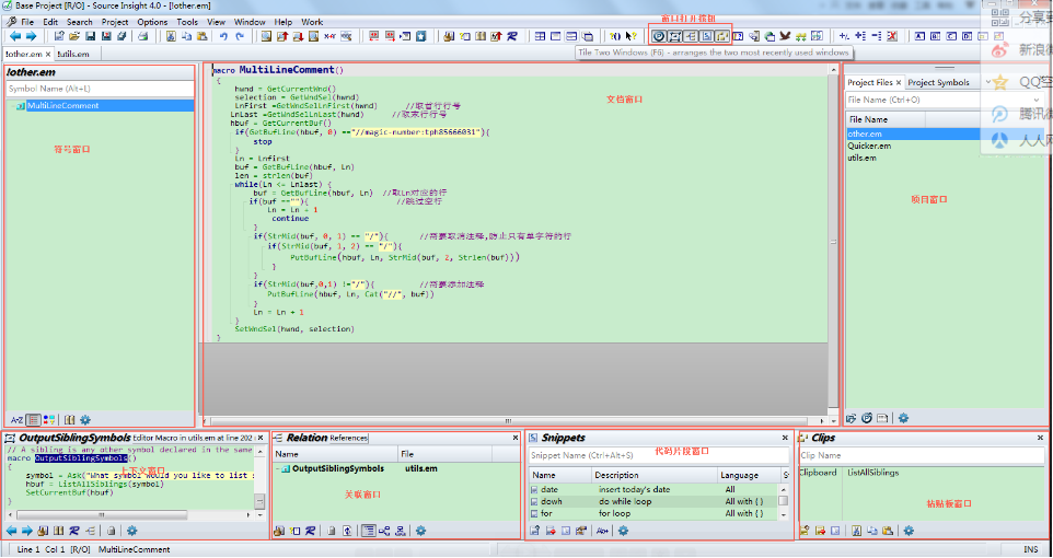 宏语言是SourceInsight定义的一种可编程语言。安装好一个SourceInsight后,打开SourceInsight,可以看到有一个base项目。打开base项目,可以看到有一个Utils.em文件,该文件就是宏语言文件,在里面可以自己写一些宏,也可以新建一个.em文件写宏,或者下载一个别人写好的.em文件如quiker.em(lushengwen写的,用的人比较多)。新建的.em或别人的.em文件要加载到base工程中(如何加载:菜单栏-项目-添加/删除文件)。