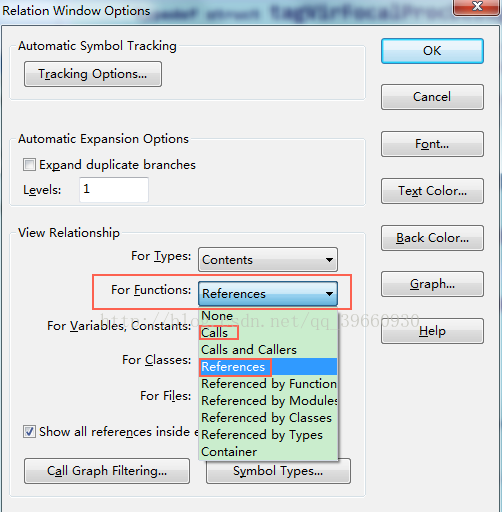 (3)、关联窗口的功能修改,右击关联窗口-窗口属性,可以修改对应符号的关系类型,选择Reference,则该窗口显示调用该函数或变量的地方,选择calls,则该窗口显示该函数调用了哪些函数。