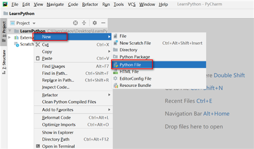 8:选中“LearnPython”,右键点击【New】->【Python File】,新建Python文件,如图:
