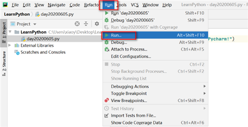 12:测试python程序运行是否成功,写一段代码,点击Run->Run,运行程序,如图: