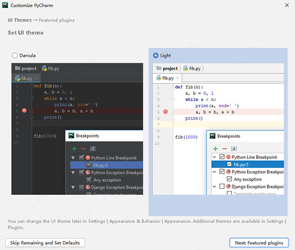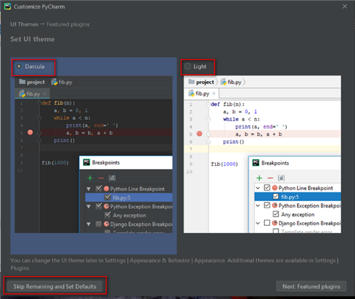 4:进入自定义PyCharm UI界面,默认背景为“Darcula”,可以调整为”Light”,其余设置选择默认,点击【Skip Remaining and Set Defaults】,如图: