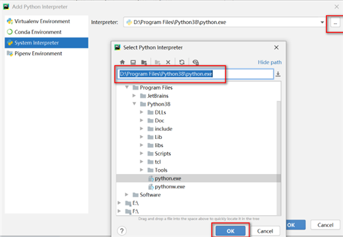 11:添加解释器页面,点击System Interpreter,点击“...",弹出解释器选择窗口,录入python.exe的存储路径,点击【OK】即可。如图: