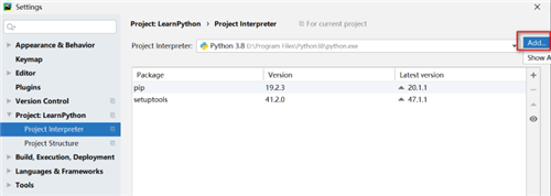 10:Python解释器设置,点击File->Settings-> Project: LearnPython ->Project Interpreter->Add,添加Python解释器。如图: