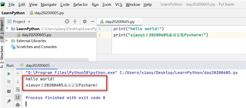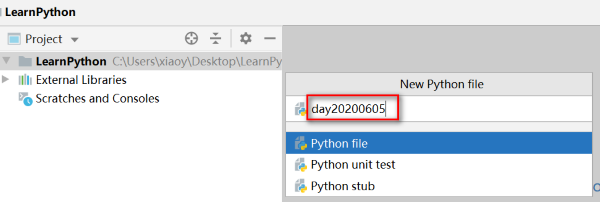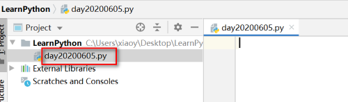 文件创建成功,LearnPython目录下生成一个day20200605.py文件,以.py结尾的文件就是python文件,如图: