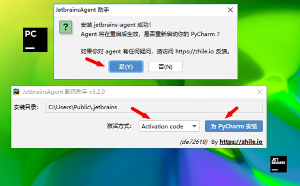 12、弹出配置助手,选择activation code,点击为PyCharm安装,再点击“是”重启软件。