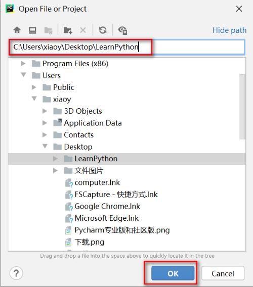 6:弹出浏览窗口,将1创建的文件路径拷贝,粘贴进去,点击【OK】按钮,如图: