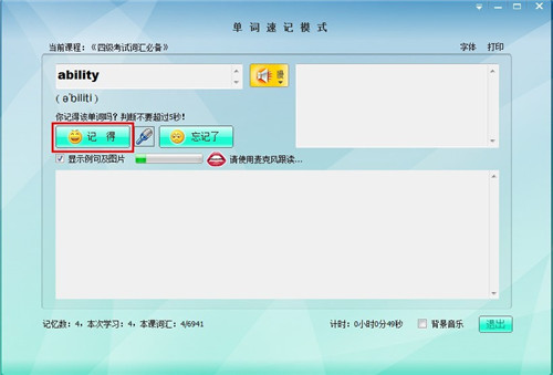 2、如果记得单词,请点击"记得"按钮,否则选择"忘记"按钮