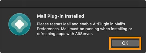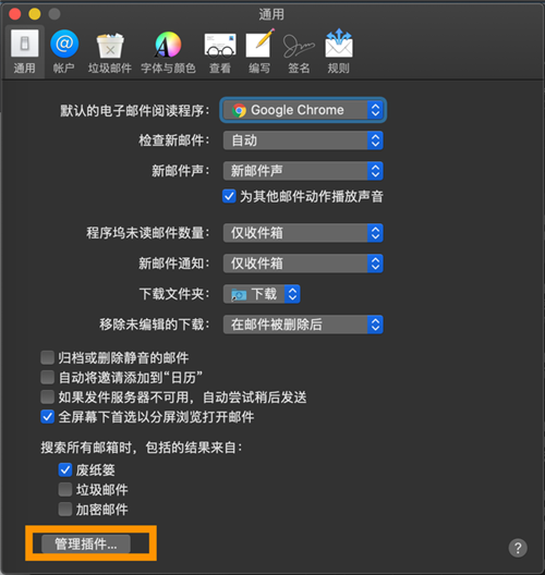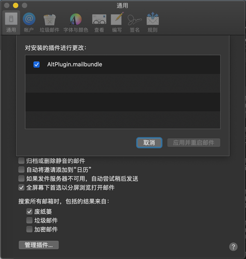 8) 打开 系统自带的邮件应用,选择"邮件"->"偏好设置"->"通用"->"管理插件"->勾选"AltPlugin "并确认重启邮件应用
