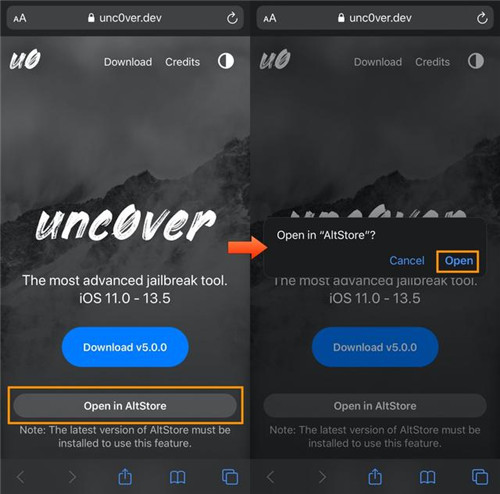 13) 在Safari中打开网页"unc0ver.dev",选择"open in AltStore"