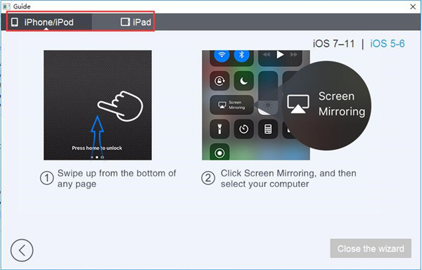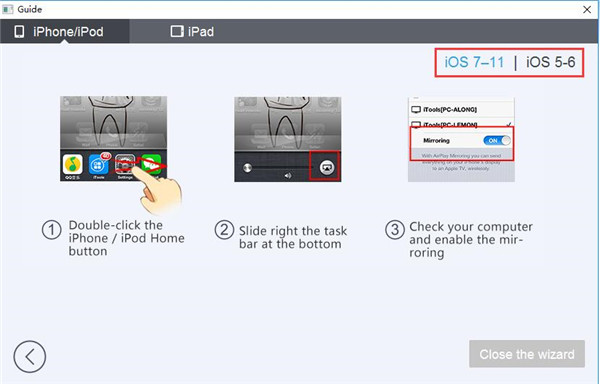 4、在界面的上方可以选择是哪种苹果设备(此处以iPhone、iPod为例,iPad可用同样方法查看)。例如图中所示为IOS7-11版本的iPhone或iPod想要投影时需要的操作。