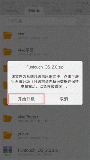 6、降级版本(注意:只有少数机型支持系统降级,不建议用户操作)对于Funtouch OS 2.0,千万不要进入Recovery载入降级包进行刷机,一定要开机进入系统——文件管理——手机U盘,然后打开降级包进行降级,否则是会失败的。具体的2.0降级1.x步骤如下: