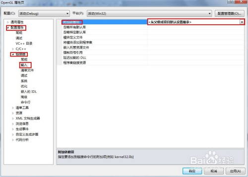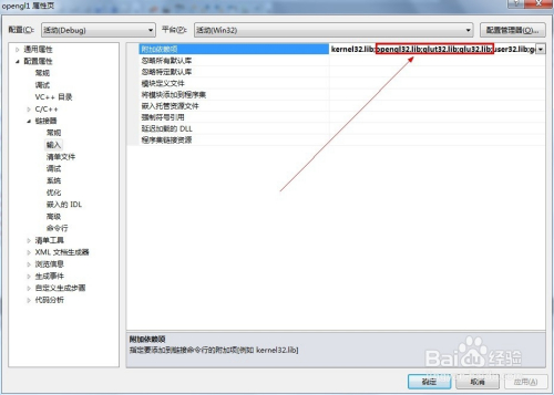 选择工程(project)->右键选择属性(project property)->配置属性(Configuration Properties)->链接器(Linker)->输入(Input)->附加依赖项(Additional Dependencies)