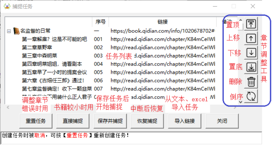 支持任务导入,即从存有章节页面链接的文本文件、excel 文档中导入任务进行捕捉;
