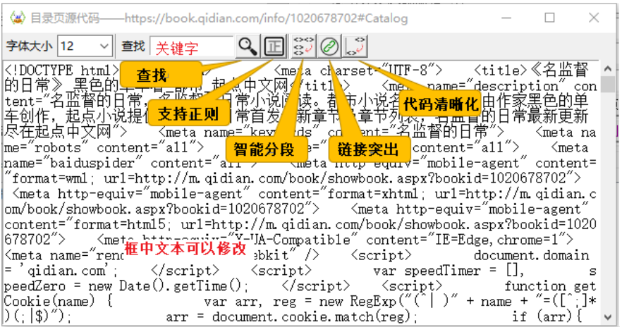 2、针对逻辑思维能力较强的用户,可以通过分析小说网站的源代码,制定该网站的捕捉规则,基本能应对大部分小说网站。