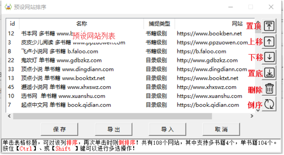 支持预设网站的添加、修改、导入、导出、排序、删除;