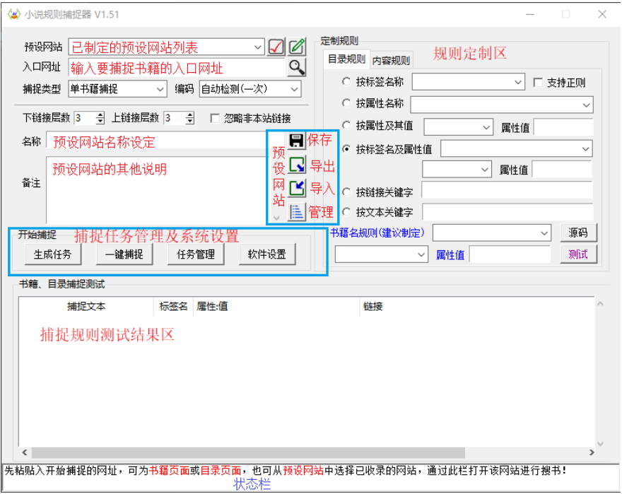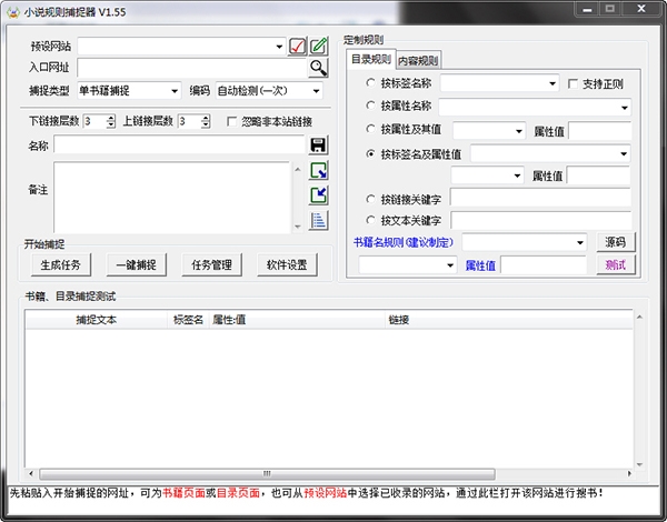 软件功能自定义规则捕捉,能对大部分小说网进行文章捕捉,个别网站对书籍分类详细的,还支持多书籍捕捉;