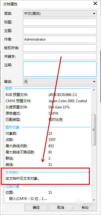拉动滚动条到文本统计,如果文本统计中显示:;该文档中无文本对象”所有文件中的文字都转曲线了