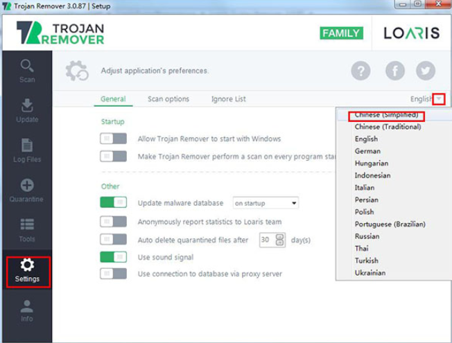 Loaris Trojan Remove官方版软件怎么设置成中文?