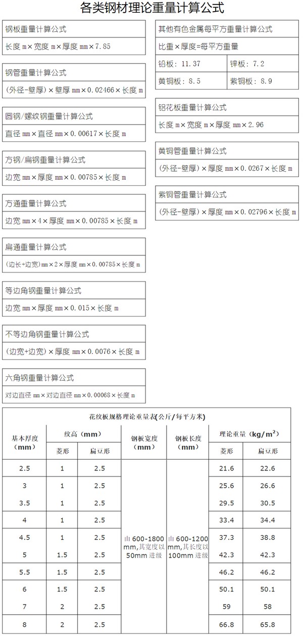 - 钢材理论重量计算的计量单位为公斤( kg )。其基本公式为: W (重量, kg ) = F (断面积 mm2 )× L (长度, m )×ρ(密度, g/cm3 )× 1/1000 钢的密度为: 7.85g/cm3