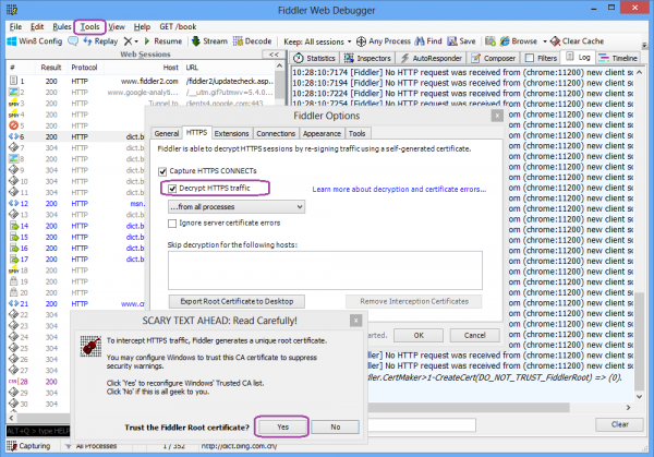 2. 如果访问的网站是https网站,则需要通过Tools - Fiddler Options - Https - Decrypt Http Traffic来设置将https解密