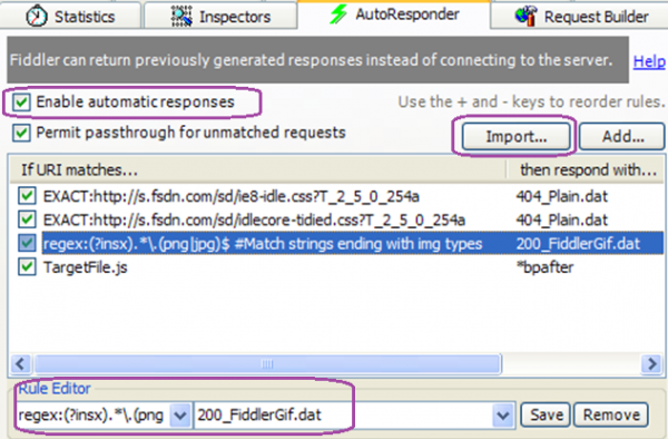请求自动回复应用也比较广,例如将其他机器抓包倒入自动回复,然后再本机回放重现问题;或者动态调试过程中不希望有些请求去调用服务器,而在自动回复中配制或者进行相应的更改直接查看效果。