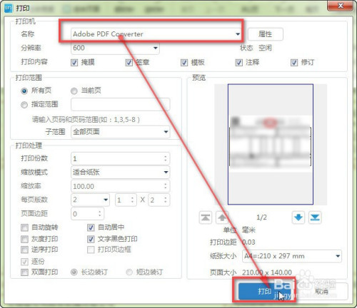 打印机更改为;Adobe PDF Converter”,单击;打印”。