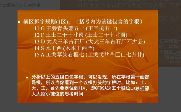 2、第一个区域是横区域,这里的横指的是你要输入的汉字的第一笔是横,只要能判断第一笔是哪个区的就可以缩小范围来寻找字根,只有熟悉了才会提高打字速度