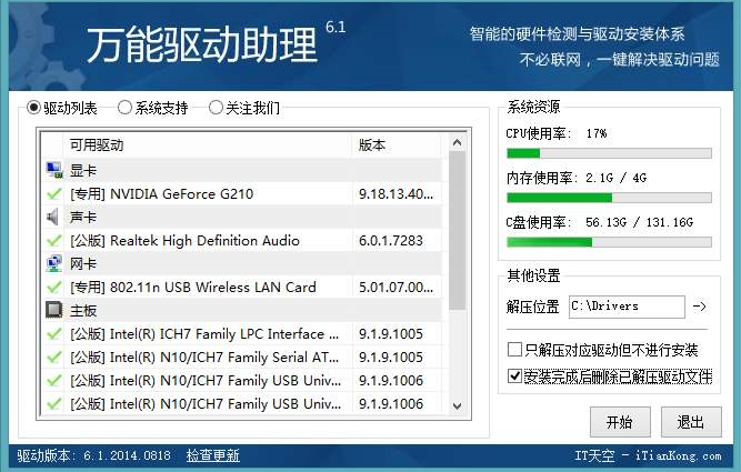 万能驱动助理,是由IT天空推出的一款适用性极强的经典驱动软件!集合了目前所有常见的台式电脑与笔记本电脑的驱动、无毒绿色无插件,并且完全免费,界面简洁、功能强大,能够智能的识别硬件设备,实现自动化离线安装驱动,相当的方便。万能驱动助理主程序采用了暗色系配色,这与之前几代以蓝色为主色系的配色均不相同。,细节方面的调整很多,例如增加了驱动分类全选/不选按钮 ,以更为方便的一键调整整个驱动分类的选中状态。