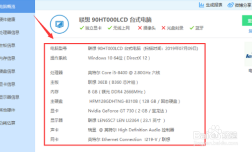 4、往右侧看,可以看到电脑型号,操作系统,处理器,主板,内存,主硬盘,显卡,显示器,光驱,声卡,网卡