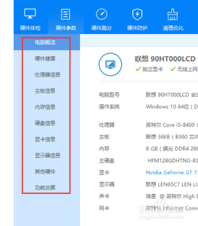 3、从左侧看,可以看到电脑概览,硬件健康,处理器信息,主板信息,内存信息,硬盘信息,显卡信息,显示器信息,其他硬件,功耗估算